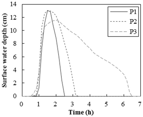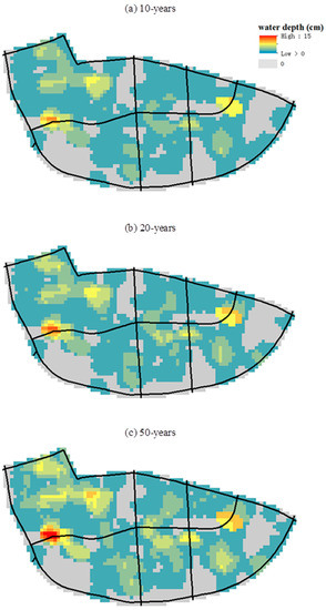 Figure 7 shows the water accumulation in the study area at the same time for different periods of regression. Clearly, with increasing rainfall intensity, the area of inundation is enlarged, and the depth of water accumulation increased. The variation of water depth in three selected areas is shown in Figure 8. It can be seen that all areas experienced a similar process of flood accumulation to a peak level, followed by recession. Nevertheless, the maximum depth and times of increase and decrease of the flood differed because of the characteristics of slope, permeability, and the drainage system.