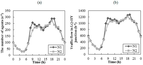 Results of traffic simulation. (a) Number of agents at each hour in the entire system and (b) traffic flow at LQ–HY junction per hour.