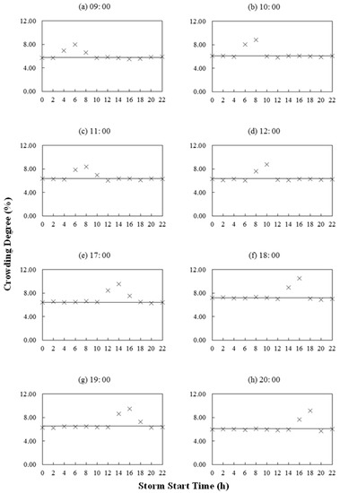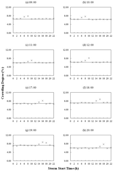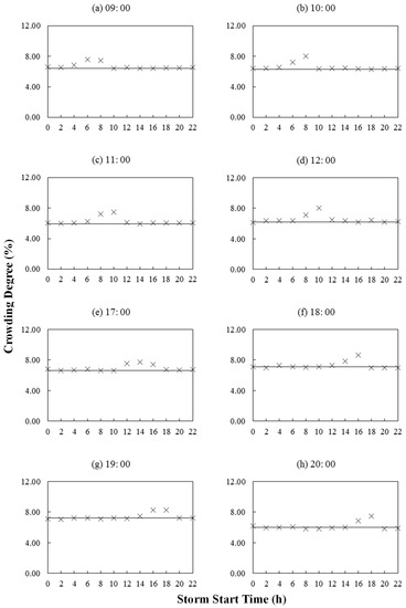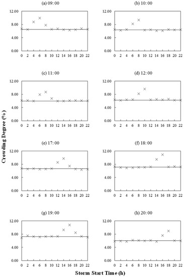 Figure 10 illustrates the case of RC (50 years) at P1 on Monday as an example. The abscissa represents the storm start time, and the ordinate shows the crowding degree. For ease of comparison, the crowding degree of a situation without flooding is represented as a straight line in the diagram. We selected 09:00, 10:00, 11:00, and 12:00 as four morning moments and 17:00, 18:00, 19:00, and 20:00 as evening moments.