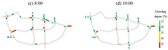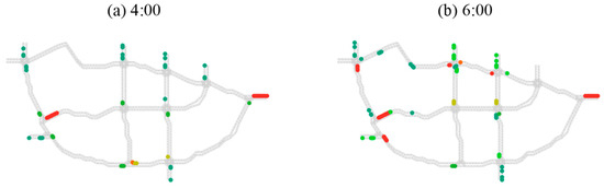 Comparison of the weekday and weekend situations, shown in Figure 10 and Figure 11, reveals that the morning weekday is crowded and that the influence of rainfall is serious. However, in the evening moments, the congestion of the two days appears similar. Overall, the traffic conditions on weekdays and on the weekend show considerable similarities. However, Figure 12a–d show the differences in the distribution of congestion at 10:00 for the four morning storm start times.