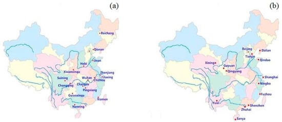 The Geographical distribution of model sponge cities in china; (a) Phase 1, (b) Phase 2.