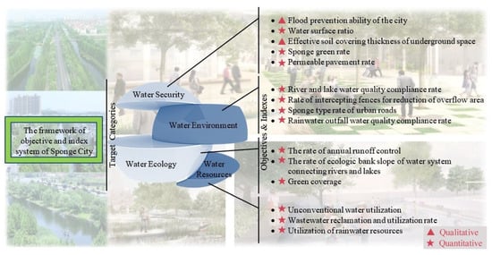 The different objectives and indexes will be classified as constraining or enabling local conditions/factors. Based on the knowledge about the local conditions and requirement of the sponge city, we have to determine the objectives and indexes which are in accord with the local problems of water security, water environment, water ecology and water resources. The best way to promote sponge city construction is to develop and implement the construction of sponge cities in local conditions on different areas []. The overall objectives of sponge cities are to encourage the use of non-conventional water resources including water security, water environment quality improvement, water ecosystem health, water use efficiency, urban flood control capacity, river and lake water quality compliance rate, and annual runoff control [,,]. The specific site indicators and detailed objectives for sponge cities are quantified by determining and implementing building indexes vis-a-vis overall objectives. The urban water runoff peak flow could be effectively reduced by fences and, green coverage and bioretention systems. Urban runoff quality could also be effectively increased by implementation of bioretention systems []. Factors such as, the degree of slopes alongside the river and lake ecosystems, runoff quality, groundwater table, and the permeable paving in urban areas were included as key parameters in the current work. The specific objectives of the development of sponge city in Changzhou city were to achieve water security assurance, water quality improvement, healthy aquatic ecosystems and effective utilization of water resources. The realization of these objectives are rest with indexes to further refine and quantify them. The relationship between objective and index is both mutually independent and unified. Framework objectives and indexes for sponge cities are presented in Figure 4.