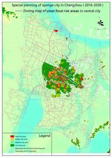 The frequency of urban water disasters caused by heavy rain or continuous rainfall can be reduced to lower design rainfall return periods by improving the capacity of inadequate urban drainage facilities []. Flooding associated with return period exceeds the storm sewer capacity which is different from what is needed for drainage water; this puts emphasis on utilizing a variety of measures to cope with rainstorm of a great return period. Flood return period and storm sewer capacity should to be comply with the drainage facilities []. By accounting for the urban water system, drainage pipe network, runoff control, low impact development construction and other measures, sponge city construction is the best way to reduce frequency of flood disaster. Changzhou city has an area with a dense water network, low-lying terrain and poor connectivity of water networks. The water-surface ratio in the center of the city is 4.4%. The pressure in terms of peak volumes of storm water entering the existing drainage infrastructure is very high and results in a higher risk of system failure than before. Therefore, the primary task of urban water safety is to improve the capacity of the drainage system in order to reduce the risk of flooding. According to the present situation of the central city in Changzhou, the existing standards of flood control and flooding are very low [].