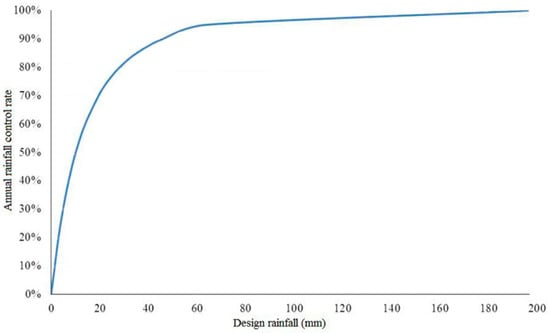 The annual runoff control rate is defined as the proportion of the rainfall which is controlled (not discharged) from the total rainfall in a year. It was analyzed and calculated according to statistical analysis of yearly data related to the natural and artificial enhanced way of penetration, storage, evaporation (transpiration), etc. []. According to the relationship between the annual runoff control rate, designed rainfall and rainfall frequency, the rainfall characteristics of Changzhou city and the rainfall data of the past 30 years were analyzed to determine the value of annual runoff control rate []. The relationship between the annual runoff control rate and the design rainfall is illustrated in Table 1 and Figure 6.