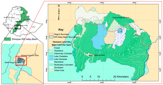 Ethiopia has many lakes of volcanic, tectonic and anthropogenic origins. Lake Hawassa and the adjoining small Lake Cheleleka are few of the several volcano-tectonic lakes formed in collapsed calderas [25]. These lakes are believed to have been a single lake in the past [16]. Lake Hawassa, an endorheic freshwater lake, is located between 6°59′3.91″–7°7′42.24″ N latitude and 38°23′17.8″–38°28′52.9″ E longitude in the Southern Nations, Nationality and Peoples Regional State (SNNPRS) and Oromia Regional State, within the Central Ethiopian Rift Valley Basin (Figure 1). Lake Cheleleka on the other hand is found about 6 km east of Lake Hawassa. Even though Lake Hawassa rests at 1680 m above sea level (asl), the edges of the caldera peaks to 2995 masl towards the south-east. The streams in the eastern caldera drain to Lake Cheleleka and the associated swamp, which in turn replenishes Lake Hawassa through the perennial river, Tikur Wuha. Lake Hawassa is the source for commercial fishing in the town of Hawassa. It is also a recreational site and tourist destination. Moreover, it is the main source for domestic, livestock and irrigation water for the community. Although the lake watershed is a closed basin, previous studies have shown that there is groundwater inflow and outflow to surrounding watersheds [21,24,26]. In recent years, Lake Cheleleka has disappeared, signifying the environmental changes taking place in the watershed.