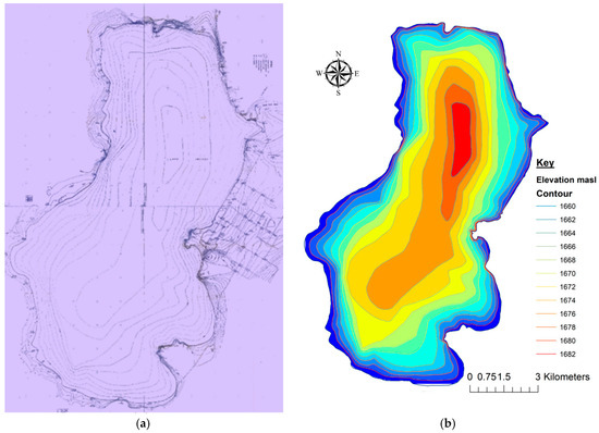 Changes in lakes can be manifested in surface area, volume or capacity changes and variation in the water quality depending on the dynamics in the contributing area, the size and shape of the water body, and the geologic formation. The study of lake morphology is important not only to understand spatial change in the shape and size of the lake, but also to comprehend its hydrologic and limnologic characteristics [5,6,7]. Historical morphometric studies in general provide information on spatial and temporal changes in erosion and sediment deposition, as well as bathymetric characteristics. This information can be used to study and remedy the implications on both physical and biological systems [8,9,10,11,12,13].