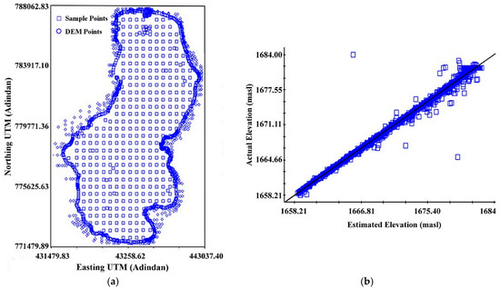 Spatial dataset. (a) Grid of sampling points; (b) cross-validation analysis graph.
