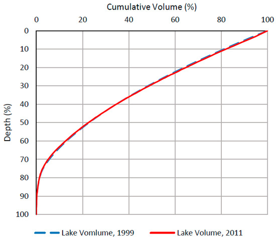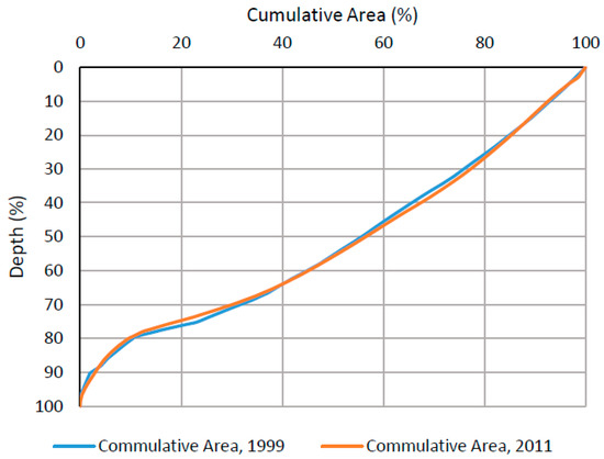 The relative hypsographic curves (Figure 7) show that Lake Hawassa has a concave upper portion and convex lower portion. This may be attributed to sediment movement within the Lake bed. It was also evident from the comparison of the hypsographic curves that in 2011 there was a horizontal cross-sectional area increase in the top 18–50% cumulative depth and a decrease in the bottom 65–88 cumulative depth percentage. Relative cumulative volume curves (Figure 8) depicted volume increase in the top 30% and a decrease between 50–75% of the cumulative depth. The increase in area and volume (as shown by the relative hypsographic and volume graphs) could be explained by the erosion of sides of the walls of the lake bed while the decrease is attributed to the deposition of sediments. The flat shapes of both curves suggest that small depth variation near the top surface results in considerable variation in the volume and surface area of the lake. The magnitudes of the slopes of the curves also suggest that small volumetric increases result in large surface area coverage. This explains the increase in surface area and, thereby, the increase in the perimeter, maximum length and width of Lake Hawassa in 2011.