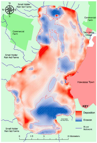 Three deposition zones, namely the western, northern and eastern, were identified in this study. The northern and eastern zones were dominantly areas of shore development for residential purposes. The town of Hawassa is located on the eastern shore (Figure 9). Reduction in depth in these parts of the lake could be attributed to urban development. The fact that the town’s road network is aligned with the slope of the watershed would easily transport sediment materials via the drainage canals that end up in the lake. The western zone is largely agricultural land where small farms and medium commercial farms are located up the slope. These farms have sparse vegetation cover and are left fallow in the dry season, as they are mainly rain fed, favoring erosion during the rainy season.