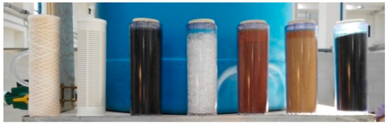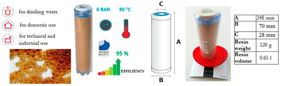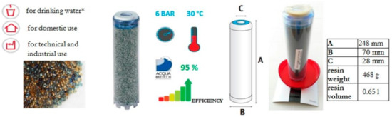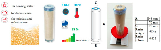 A mixed-bed resin filter cartridge works for water treatment, since it is a mixture of anionic and cationic resins that are able to remove simultaneously both the cations (exchanged with hydrogen ions) and the anions (exchanged with hydroxyl ions) from water [29,31]. In this work, the one described in Figure 10 has been adopted.