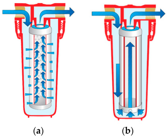 - radial flux: The fluid flows through the cartridge with a side entrance (lateral inflow), the solid particles deposit in the filter, and, once water reaches the central part, it flows upward (outflow) through the duct created in the inner core (Figure 2a);