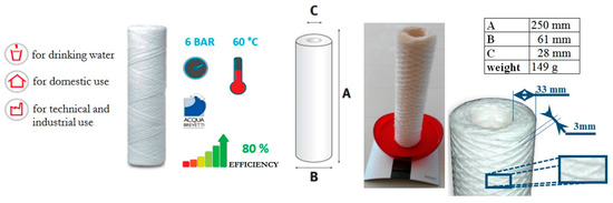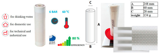 A wire-wound filter cartridge works for mechanical filtration [19]. It is produced by winding a wire on a central support core, both made of pure polypropylene, very tenacious and non-toxic, that makes it suitable also for the treatment of drinking water [15]. The one adopted here is of the type in Figure 3, in which size, weight and efficiency are also reported. The filtering set has a particular honeycomb uniform texture, with pore size nominal rating of 50 μm.