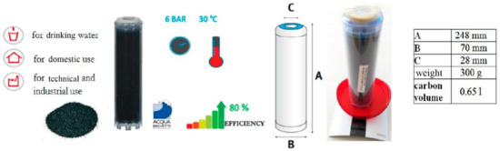 A granular activated carbon filter cartridge works for water treatment, because it removes halogenated organic substances, such as trihalomethanes and other DBP (disinfection by-products), pesticides, herbicides, triazines, chlorine, and other substances that impart unpleasant odors and flavors, and color [24,25].