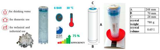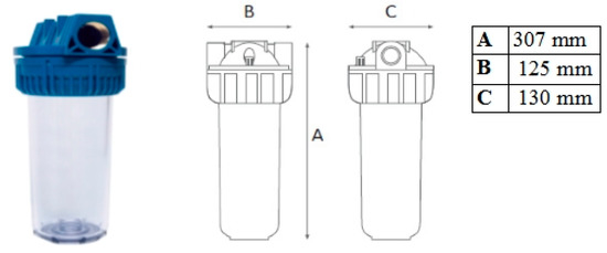 A filter cartridge in cationic resin falls into the category of cartridges for water treatment, as it softens the water, thus eliminating its hardness [29]. The one selected for the experiments is described in Figure 8.