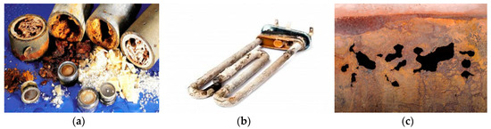 Effects of limestone on (a) a tube [27] and (b) the resistance of a washing machine; (c) effect of corrosion on a pipe [28].