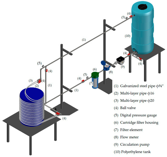 The hydraulic pilot circuit (Figure 11) designed and built in the LIDAM laboratory at University of Salerno was aimed at simulating a generic residential plant with a cartridge filtration system, so it was made of pipes with commercially popular materials and diameters. It consists essentially of [19]: