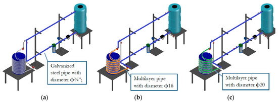 Hydraulic flow course in the three considered modes, respectively: (a) bypass of the multi-layer pipes and use of the only short galvanized pipe of the circuit; (b) multi-layer pipe with diameter ϕ16 opened; (c) multi-layer pipe with diameter ϕ20 opened.
