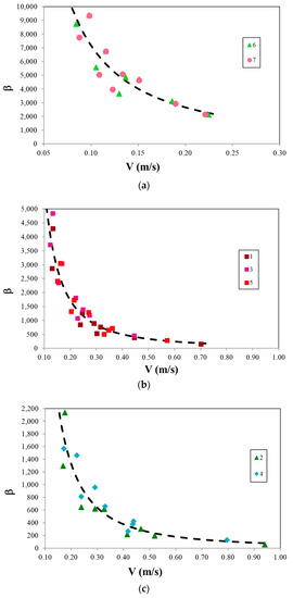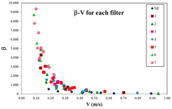 which is plotted as “trend line” in Figure 16 and approximates very well all the curves. This equation may be used in general to evaluate, at least approximately, if the velocity of the flow is known, the value of the coefficient β, and, therefore, the head loss produced by the filter through Equation (1).