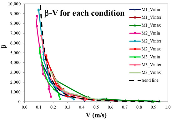 Values of the calculated coefficients β as function of the corresponding values of mean velocity V for all the considered scenarios with trend curve.