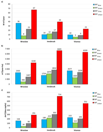 The highest total WFurban of 67 Mm³/year was obtained by Wroclaw, a 41% lower value for Innsbruck (39 Mm³/year) and a 65% lower value for Vicenza (23 Mm³/year) (Figure 2a). These values are in accordance to the size of the cities. For Wroclaw, WFblue is dominating (36 Mm³/year), the second value is reached for WFgrey (23 Mm³/year), and the lowest value for WFgreen (8 Mm³/year), due to the relatively small share of the permeable area (24%) in the urbanized area and local climate. For Innsbruck, all three WFs are similar, with the smallest value for WFblue (10 Mm³/year), middle value for WFgreen (12 Mm³/year), and highest value for WFgrey (17 Mm³/year). In Innsbruck, relatively high WFgreen in proportion to other WFs in comparison to other cities is associated with a very high percentage of permeable area (ca. 82%) which consists of a green area. In Vicenza blue and grey WFs are comparable (10 and 9 Mm³/year respectively) and the least significant is WFgreen (5 Mm³/year), reflecting small percentage of permeable area (ca. 35%).