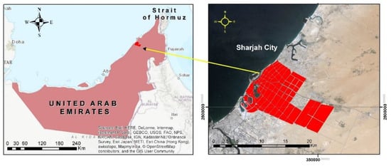 The Sharjah city has geographical coordinates of 25.3° N 55.5° E and is located on the coast of the Arabian Gulf. It is in a hot, dry region, with daily temperature highs of 24–42 °C and mean temperatures of 18–34 °C. The rainy season of Sharjah city typically occurs from December to March, and the average rainfall is about 100 mm/year. Figure 1 shows the UAE map and Landsat image of Sharjah city, with the study area identified.