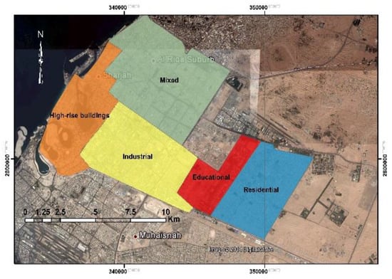The second method was based on classifying the different land cover features and digitizing them manually based on visual inspection and knowledge of the area. Older images typically had a lower resolution than recent images; however, many of the old features remained standing and appeared in recent images. As the digitization process is tedious, saturated urban blocks were digitized as units and the digitized areas were distributed between the different land use types by ratio. Figure 2 shows the land use classes in Sharjah city.