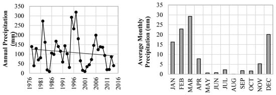 Annual and average monthly rainfall recorded at Sharjah International Airport during 1977–2014 and average annual rainfall during the same period (produced from Merabtene et al. []).