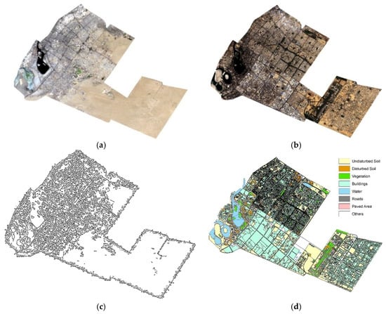 In this study, two approaches were adopted to quantify and assess the pattern of urbanization. The first approach relied on extracting linear features (buildings and roads) from multi-temporal satellite images [,,,], and the second approach relied on extracting linear features from vector (digitized) data []. The images in Figure 4 provide a visual estimation of expansion of built areas in the city for the years 1987 and 2014 as shown in the Landsat images, Figure 4a,b. As can be seen from Figure 4c (edge detection) and Figure 4d (manual digitization), there was a significant amount of urbanization (built up area expansion) over the years in the study area. The manually digitized images (Figure 4b) show that features in some areas were not digitized individually but rather, they were analyzed in blocks. This was due to the fact that the area had large warehouses with little separation between them. The digitization of blocks was also used in mixed use and other areas where building densities were high to simplify the tedious digitization process.