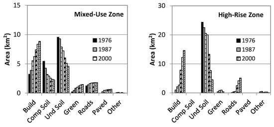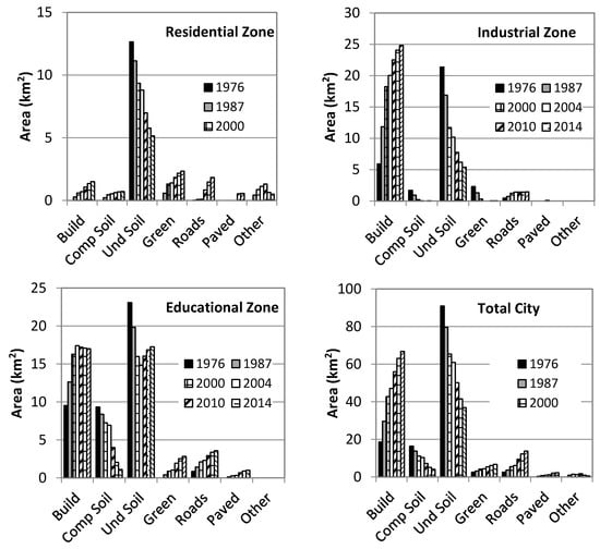 The seven land cover classes (buildings, roads, paved area, undisturbed soil, disturbed soil, vegetation, and others) in each of the five land uses changed during the study period as shown in Figure 5. Clearly, land covered by buildings, roads, paving materials, and vegetation expanded due to undisturbed and disturbed soil cover during the study period of 1976–2016.