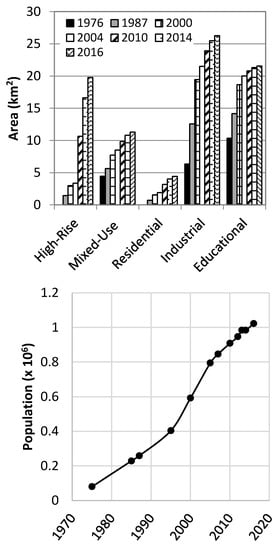The built area in each of the land use zones included buildings, roads, paved areas and other built land cover features. The undeveloped open area included undisturbed soil, disturbed soil and vegetation. Figure 6 shows the expansion of built areas in the various land use zones of the city during the period from 1976 to 2016 (years 1976, 1987, 2000, 2010, 2014 and 2016 are shown in the figure). Overall, the built areas expanded by approximately four times; from approximately 20 km2 (around 15%) to about 80 km2 (around 60%) out of approximately 130 km2 of total study area. At the same time, the undeveloped open areas declined from approximately 110 km2 (85%) in 1976 to about 50 km2 (40%) in 2016. Figure 6 also shows the population growth in Sharjah city as being the most influential factor for expansion of the built area. The estimated population of Sharjah city (Figure 6) grew from approximately 80,000 people in 1976 to approximately 1 million in 2016, which represents a more than 10-fold increase compared to the four-fold increase in built areas. The expansion of built areas and dramatic population growth reflect the rapid economic growth of Sharjah and the UAE during the study period.