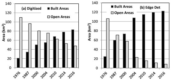 The overall expansion of built areas and shrinkage of open areas in the city is shown in Figure 7. The built and open areas estimated from Landsat images using direct digitization (Figure 7a), and edge-detection (Figure 7b) techniques are shown in Figure 7. Compared to direct digitization, the edge-detection method significantly overestimated built areas and underestimated open areas. The areas estimated using the manual digitization technique were considered more representative of land features and were used in this study.