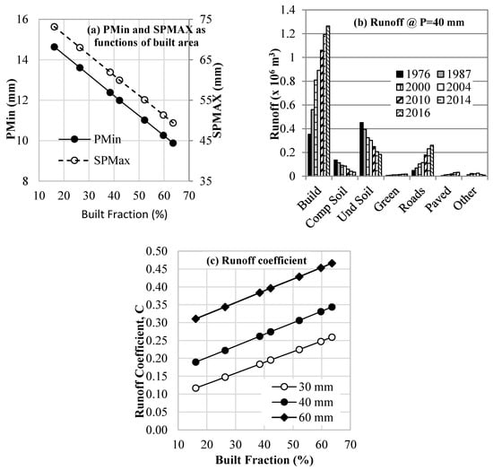 Examples of changes in flood characteristics during the period from 1976 to 2016 are shown graphically in Figure 8. The minimum precipitation required to generate runoff (PMin) declined in the city as the built area increased over time, or as the impervious areas expanded. The minimum precipitation required to generate runoff in built areas declined from about 15 mm in 1976 to about 10 mm in 2016. Similarly, the potential maximum storage, SPMax, declined in the city over time as urbanization expanded from about 75 mm in 1976 to about 50 mm in 2016. Figure 8 shows linear decreasing trends for both PMin and SPMax with an increasing built fraction. An example showing excess rain (i.e., potential runoff at 40 mm precipitation) from the different categories of land cover over the study period is also shown. The data show that excess rain increased with time in the expanding built areas and decreased in the shrinking open areas. With the fraction of built areas (land cover with higher runoff coefficients) increasing from 15% in 1976 to approximately 60% in 2016, the runoff coefficient increased linearly (with built areas fraction), as seen in the example presented in Figure 8 at three different precipitation values. The data show that the runoff coefficient increased linearly with increasing urbanization in the city at the presented precipitation values.