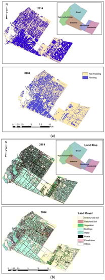 Flood and urbanization maps for years 2004 and 2014. (a) Flooding maps in 2004 and 2014; (b) land cover land use maps in 2004 and 2014.
