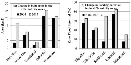 As seen in Figure 10b, land cover in the residential land use zone significantly changed, from undisturbed soil to buildings. In parallel to rapid urbanization in residential land use zone, the flooding potential increased substantially in the residential land use zone. This can be seen as an evidence of a strong relationship between urbanization and floods. It can also be seen from Figure 10b that the industrial land use zone is very flood sensitive region. Figure 11a shows how the flooded area percentage changed from 2004 to 2014 for different land use zones. Figure 11b illustrates the change in the built-up area (as an indicator of urbanization) between years 2004 and 2014 for different land use zones.