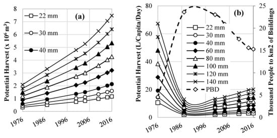 The available data suggests that the population to building area ratio (i.e., population to building density, PBD) increased between 1976 and 1987, from about 5000 people/km2 to about 24,000 people/km2. During that period, the main parts of the city became nearly saturated with multi-story buildings. On the other hand, the inland expansion of the city starting in the 1990s involved the building of detached family dwellings, which helped to reduce the PBD after 1987 to about 15,000 people/km2 in 2016. The per capita water harvest reflected the PBD, as did precipitation. As can be seen in Figure 13b–d, for the average annual rainfall of approximately 100 mm/year in the city, the annual water harvest reached an average of 15 L/capita per day over 365 days, 30 L/capita per day over 180 days of the rainy season, and about 40 L/capita per day over 120 days of the rainy season. The per capita potential rain harvest numbers are significant and constitute approximately 10% to 30% of the water consumption of residents (approximately 200 L/capita/day) in Sharjah city.