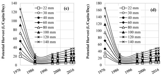 Assessment of rainwater harvesting potential in Sharjah due to urbanization during 1976–2016: (a) rainwater harvesting potential (in m3) from rooftops of buildings with different amounts of rainfall; (b) per capita potential rainwater harvesting in the city averaged over the whole year; (c) per capita potential rainwater harvesting in the city averaged over six months (rainy season); and (d) per capita potential rainwater harvesting in the city averaged over four months (winter season).