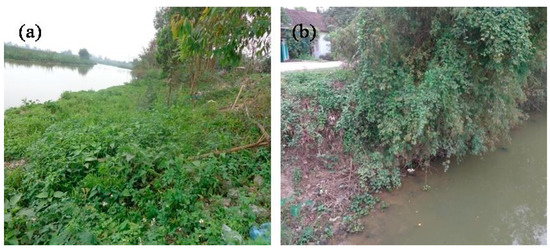 Vinh City is located in the Nghe An province, Vietnam and it has subtropical monsoon [2,12]. The current study sites were located near the Tanphuong bridge area (18°42′ latitude and 105°39′ longitude) of the Cuatien River. These sites were located within a straight reach. The width of the riprap and gabion revetments were 8 and 3 m, respectively, along the river bank. The distance between the two experimental plots was approximately 500 m, to ensure that the environmental and hydrological regimes and their influences were nearly similar in the two experimental plots. The experimental plots were constructed at a location on the Cuatien River bank which were eroded by the rapid fluctuations in river water level and flow. Cuatien River has a length of 25 km, a width of 18 to 60 m, and a depth of 0.86 to 2.45 m. It starts from Namdan county and flows through the delta of Hungnguyen county and merges with the Lam River in Vinh city (Figure 1). It is not only an important source of freshwater for the region, but it also plays an important role in the water ecological system of Vinh city. There are residential areas, farm lands, and animal farms on both sides of the Cuatien River catchments, which produce large amounts of domestic sewage and garbage. The lack of proper garbage collection and sewage treatment systems are the key factors that contribute to the deterioration of river water quality.