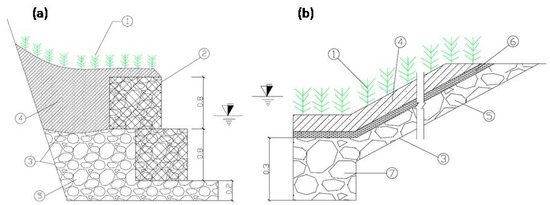 Schematic design of: (a) gabion revetment structure; and (b) riprap revetment structure (1. Vetiver plants; 2. gabion; 3. geotextile; 4. fill soil; 5. limestone; 6. gravel; and 7. base structure).