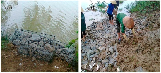 A water flow meter, fitted with a flow probe (Xiuyan Precision Instrument Factory, Anshan Liaoning, China) was used to determine the velocity of the river flow. The flow meter was fixed to the boat to determine the flow velocity along the river. The velocity of the river flow ranged from 0.05–0.09 m/s during the dry season and 0.31–0.53 m/s during the rainy season. Although the flow velocity is not high in Cuatien River, the hydrological behavior is significantly affected by the exchange of tide regime at the mouth of the Lam River. Therefore, the water level changes frequently, which is the main cause of erosion in the river banks (Figure 2). Hence, the prevailing river hydrological conditions were considered to design and construct the ecological revetments. In addition, on both sides of the river, the soil levee work was constructed to prevent flood that is too easy to convert and construct the ecological revetment work. Sandy clay soil with the following characteristics: cohesion C = 6.8 (kPa), internal friction angle Ф = 23°, and proportion ɣ = 1.8 (t/m3), was used as the main construction material to build the levee structures. Since the slope along the river bank is different from the topography, which has a slope rate of 18–63°, a proper design of the ecological revetment to transform the bank structure is extremely important. Riprap is relatively easy to install, is flexible and can be easily repaired, requires low maintenance, and has a natural appearance. Side slopes from 1:3 (18°) to 1:2 (26°) are recommended for riprap stability [13]. The riprap revetment structure was applied in the low slope banks where the slope is lower than 26° (steepness m = 0.5), whereas the gabion revetment structure was applied on a high slope bank where the slope is higher than 26° (steepness m = 0.5) [14].