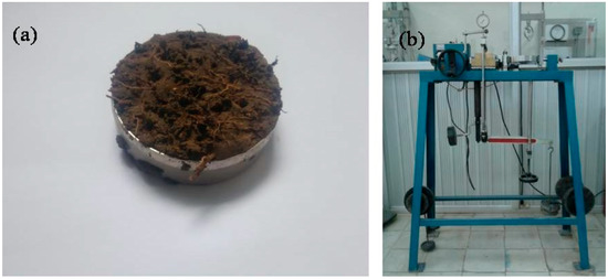 Experimental setup for determining the direct shear strength of the soil: (a) soil sample; and (b) experimental device for measuring the direct shear strength (photos were taken on 26 May 2016).