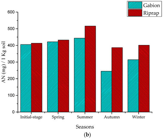 The results show that the SOM and AN levels were increasing in the seasons of spring and summer. In the three months of spring, the riprap’s SOM and AN indicator values of the surface soil layer increased to 3.74 g/kg and 19.02 mg/kg, while the gabion’s SOM and AN indicator values increased to 2.75 g/kg and 19.02 mg/kg, respectively (Figure 6). During the three months of summer, the riprap’s SOM and AN indicator values increased to 7.06 g/kg and 84.08 mg/kg, while the gabion’s SOM and AN indicator values increased to 3.86 g/kg and 21.95 mg/kg, respectively.