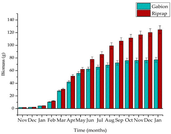 During the autumn season (from August to October), the growth of Vetiver grass on the gabion and riprap revetments were 68.79 ± 3.43 and 99.14 ± 4.96 g, respectively. The Vetiver biomass growth rate in the gabion and riprap revetments was 4.35 and 11.68 g/month, respectively. During the autumn season, the continuous heavy storms (332.6 mm/month) caused a reduction in the soil nutrient concentrations, leading to low values of SOM and AN. This adversely affected the Vetiver grass biomass on the gabion and riprap revetments. With a vertical form and porous structure, the gabion soil layer lost nutrient and soil particles significantly, causing dissatisfaction of Vetiver grass nutrition. However, after a planting period of eight months, the riprap’s Vetiver grass root pierced through the stone layer and directly absorbed nutrients from beneath the riprap stone layer. Therefore, Vetiver did not primarily depend on the nutrient source from the riprap surface soil layer. Under such conditions, the biomass weight of the gabion’s Vetiver grass was significantly lower than the riprap’s. During the winter season (from November to January), with lower temperatures (19.9 °C), rainfall (111.8 mm/month), and low sunshine hours (88.5 h/month), Vetiver plant biomass growth in the gabion and riprap revetments significantly declined. The biomass of Vetiver grass on the gabion and riprap revetments were 77.12 ± 3.94 and 124.61 ± 6.23 g, respectively. The Vetiver plant biomass growth rate in gabion and riprap revetments were 2.78 and 8.49 g/month, respectively. Riprap’s Vetiver grass showed rapid growth in spring, summer, autumn, and slow growth in winter. On the other hand, the gabion’s Vetiver grass showed rapid growth in spring, summer, and slow growth in autumn and winter. Mickovski et al. [24] showed that the dry shoots of 22 Vetiver plants could reach a weight of 70.05 ± 8.04 g with in a period of one year (2012–2013) when grown on different types of ecological revetments. The experimental results from this study revealed that Vetiver grass has good ability for growth and reproduction on the ecological revetments. The results indicated that high values of temperature and humidity, long sunshine hours. And soil nutrient content during the spring and the summer season, will facilitate the rapid development of the Vetiver biomass. However, the Vetiver biomass began to decrease with rainfall, due to the decline of the nutrient content during the autumn season.