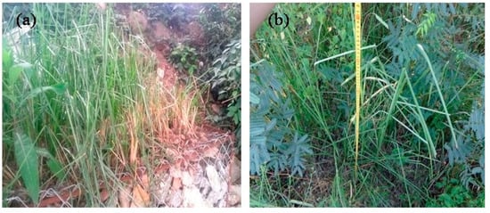 Vetiver growth on: (a) gabion; and (b) riprap revetments (photos were taken on 23 October 2016).