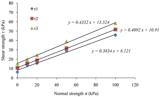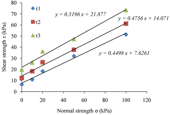 To investigate the effect of shear strengths (τ1, τ2, and τ3) of the soil samples during 0, 6, and 12 months, the soil samples were subjected to direct shear test under normal strength as σ1 = 10 kPa, σ2 = 20 kPa, σ3 = 50 kPa, and σ4 = 100 kPa. The results of the shear strength experiments are shown in Figure 9. The cohesion C, and internal friction angle Ф, calculated through the Coulomb formula (Equation (1)) are presented in Table 4.