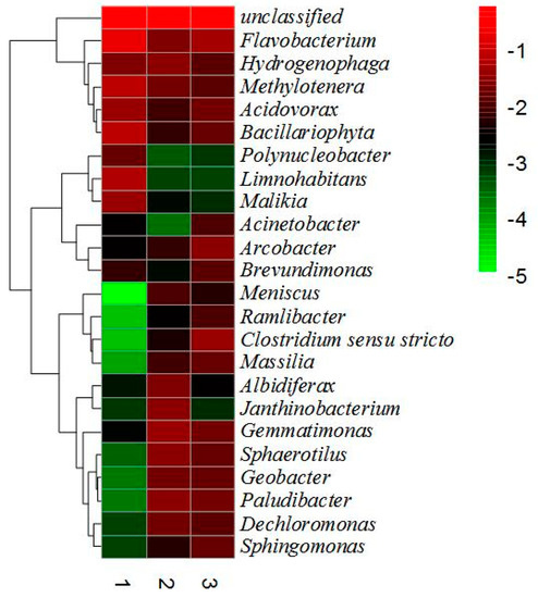 The results showed that the total number and diversity of microorganisms attached on the gabion and riprap revetments were much higher than that of the suspended microorganisms in the water. The results revealed that the total number of microbial communities and their diversity in the riprap revetment was highest, because the riprap revetment is suitable for the growth of plants, it has a rather strong root systems, and the gap between the stones also provide adequate conditions for the growth of microorganisms. It is one of the main reasons for rich microbial diversity in the riprap revetment [33]. Through high sequencing technology, the number of bacteria was estimated at 198, 332, and 351 in water #1, gabion #2 and riprap #3 samples, respectively. The results of species composition, based on its detection and classification at the genus level, is shown in Figure 10.