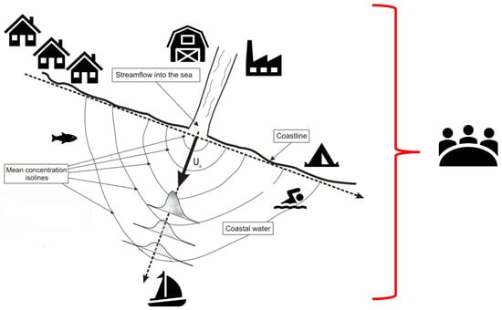 The analytical setup for the calculation and prediction of concentration statistics in environmental flow was already introduced by several authors in different media [,,]. The similar methodology is used by [], but implemented in surface water systems, more precisely in an estuary as presented in Figure 1. In this manuscript, the problem is emphasized within the broader framework by taking into account all the potential stakeholders and decision makers (Figure 1).