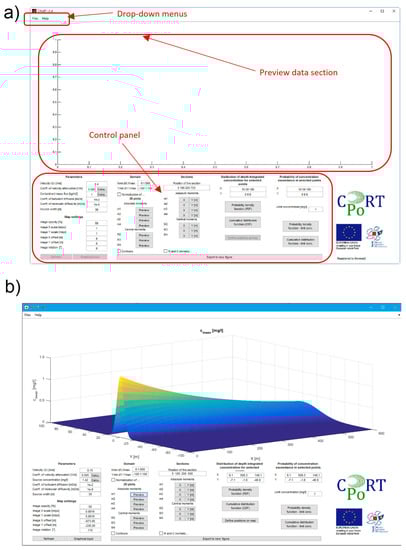 One of the main outcomes of the projects was the development of a tool for the quick assessment of the probability of exceeding the limit concentration. Due to its simplicity, it is supposed to be user-friendly and available to different stakeholders. The coding and the application were developed in the Matlab-integrated development environment []. In Figure 2, we present the main working interface, along with an example of mean concentration visualization (surface plot). The application has a fully graphical interface, implemented as a single main tab and series of secondary tabs for the calculation and visualization of data. To get better spatial reference, there is an option to upload the map which may, in fact, be a screenshot of Google Earth or from any other freely available open spatial data service. However, the scaling and rotation factors within the working interface need to be adjusted in order to ensure a good spatial fit. In general, a very limited amount of input data is required, which makes the CPoRT quick and practical. Those data are organized into two blocks: parameters and domain. An arbitrary rectangular domain may be set in accordance with the user’s interest when analyzing an area, and it is defined by the initial and final value of X or Y, and an increment. The parameters block requires more data, some of which are measured data, but when testing different scenarios, a user may obtain outcomes for different values. However, it is necessary to have the initial riverine velocity (m/s) at the source, contaminant source concentration g/m3, and the source width (m). The source concentration may be calculated in an additional dialog box if the contaminant mass flux is known ( kg/day).