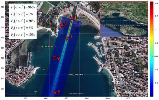 In Figure 3, we present the map (courtesy of Google Earth) of Žrnovnica estuary which was imported into the CPoRT application. The plot is modified to emphasize the location of the case study and the positions of three arbitrary chosen points where the probabilities of exceeding the limit concentration were calculated. The developed methodology is based on the calculation of the conservative pollution concentration moments, hence we present the evolution of the mean value and variance along the downstream sections in Figure 4a,b.