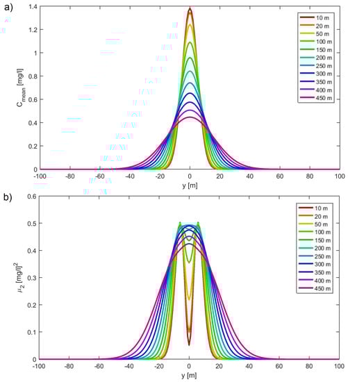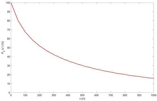 The obtained concentration moments evaluation enabled the retrieval of the PDF at an arbitrary point. In this work, a simple moment matching method is applied to obtain the PDF. Following the previous research [,,] for other environmental flows, a Beta distribution is used, and both PDF and CDF were calculated. Finally, the application of the presented statistical tools is the probability of exceeding, , for an arbitrary concentration, , as defined: