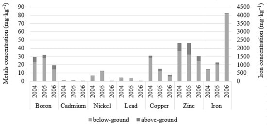3.3.3. Boron and Heavy Metals in Biomass and Soil